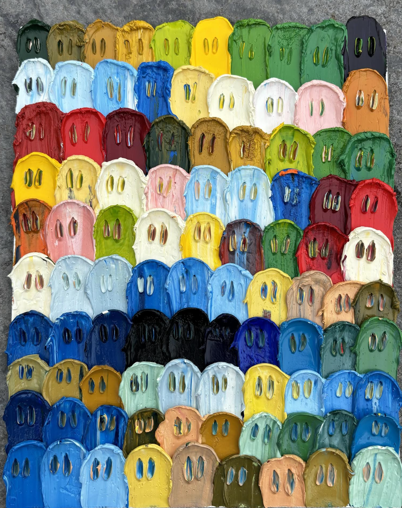 I saturate the colors and use palette knives to further distort the painting from its source. I apply thick paint to the surface of my substrates, and mark making then intensify the shapes and lines within the image. The colors in the work talk to each other, as the color palettes from the previous work gets translated into these color swatch paintings, acting as a new understanding of the source image. Color and shape bring associations to mind, allowing the viewer different avenues to make sense of the work. Overall, the size of the paintings evoke the viewer to come close to view the tactility of the marks and the colors packed within one section of the piece.